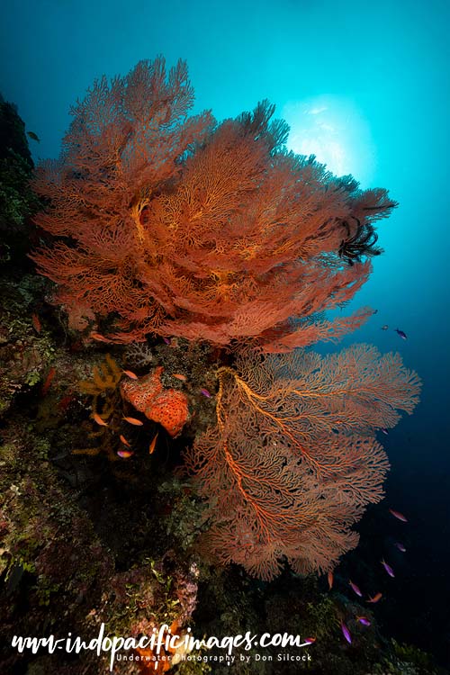 Secret Spot: — a lush coral slope draped in sea fans and long, colourful sea whips, alive with anthias, fusiliers, and the occasional cruising reef shark.