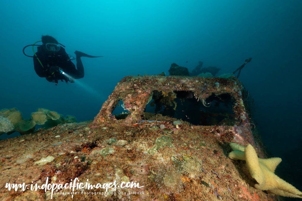 Today, this WWII scrapyard has transformed into a thriving artificial reef with trucks, jeeps, tractors, bulldozers, vast amounts of ammunition, and Coca-Cola bottles, all located in 5 to 30m of water, just off the shore.