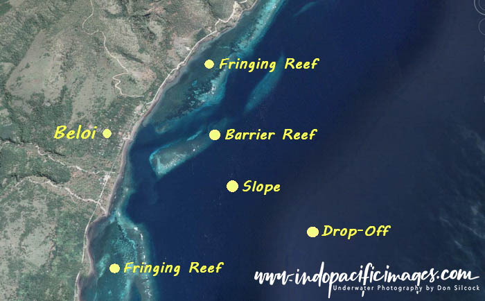 Beloi is located in a large sheltered bay that features shallow fringing reefs to the north and south of the village. Plus a small barrier reef and a wide slope that leads down to the big drop-off in to the depths.